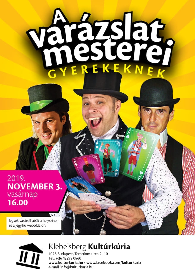Hazánk legjobb gyerekbűvészei közül – Varázs Tamás, Nagy Molnár Dávid, Kőhalmi Ferenc – szerepelnek együtt egy színpadon, felejthetetlen élményben részesítve nem csak a csemetéket, de a gyermeklelkű szüleiket is. Az előadás kétrészes, és még a szünetben is meglepetésekkel várják a családokat. Természetesen a varázslatokon lesz a hangsúly a Klebelsberg Kultúrkúriában, de néhány dallal is készülnek a művészek a nézőknek. Az előadást elsősorban a 4-10 éves korosztálynak ajánlják.