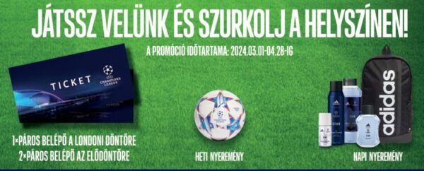 Nyerj páros belépőt az UEFA Champion League elődöntőire, adidas UEFA Champions League 2024 labdát, vagy adidas táskát adidas UEFA Star Edition kozmetikumokkal.