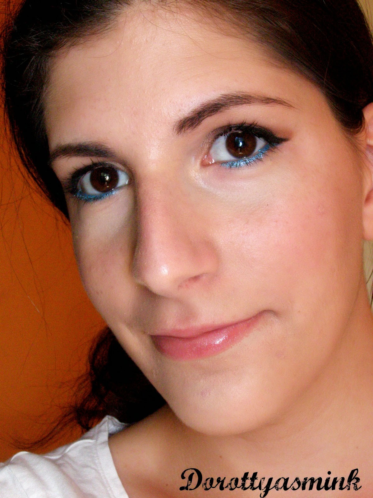 Alulra, a szempillatőbe és a vízvonalra két élénk kék szemhéjpúder keveréke került.