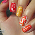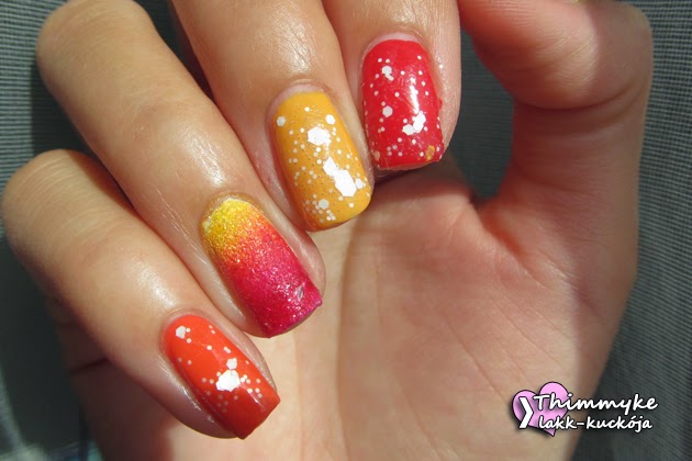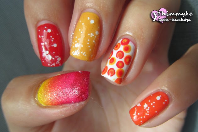 A heti téma a sárga és piros színtartomány színeit foglalja magába. Volt egy elképzelésem, ami katasztrofálisan sikerült, majd lett egy második, ami szintén nem igazán tetszett, ezért egy harmadik verzió lett a befutó, amit itt láthattok. Egy körmömre sárga, egyre narancs egyre pedig piros lakk került fehér csillámos topperrel, a gyűrűs ujjam fehér alapon pöttyös lett, a hüvelyk ujjam pedig ombre sand.