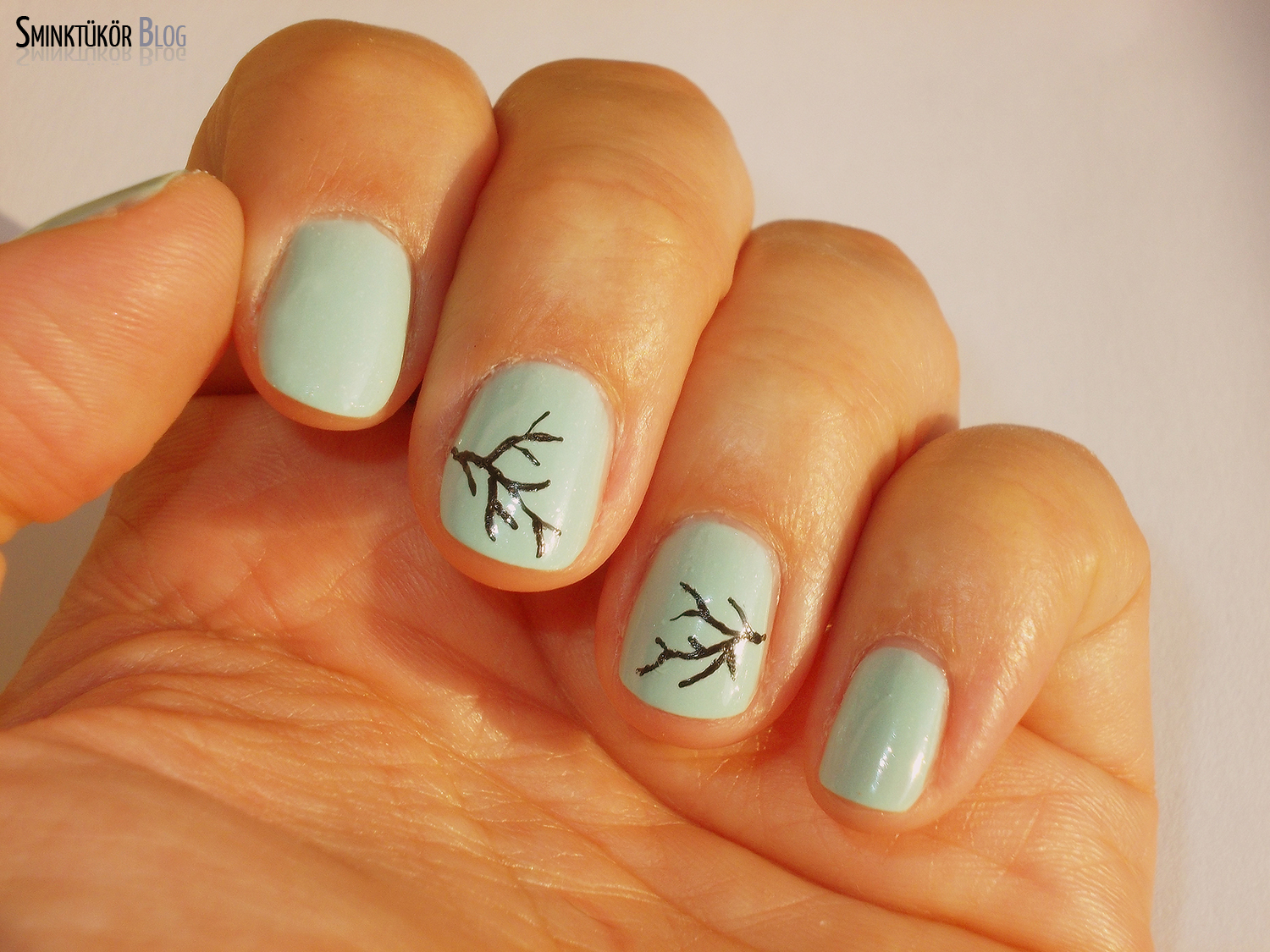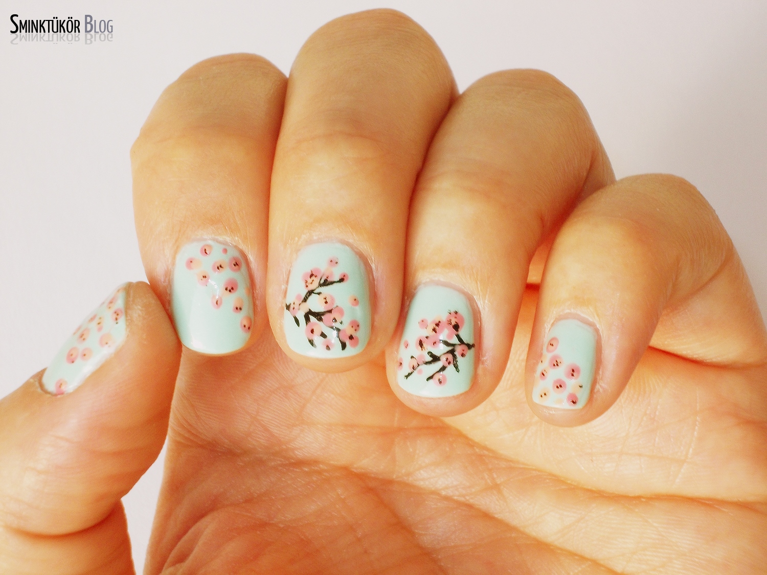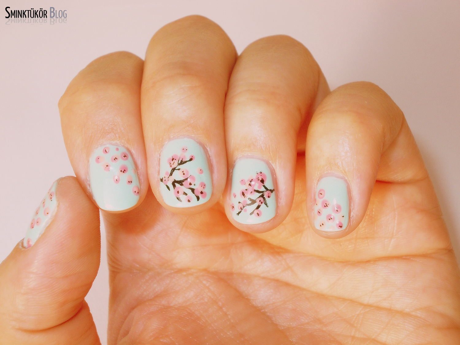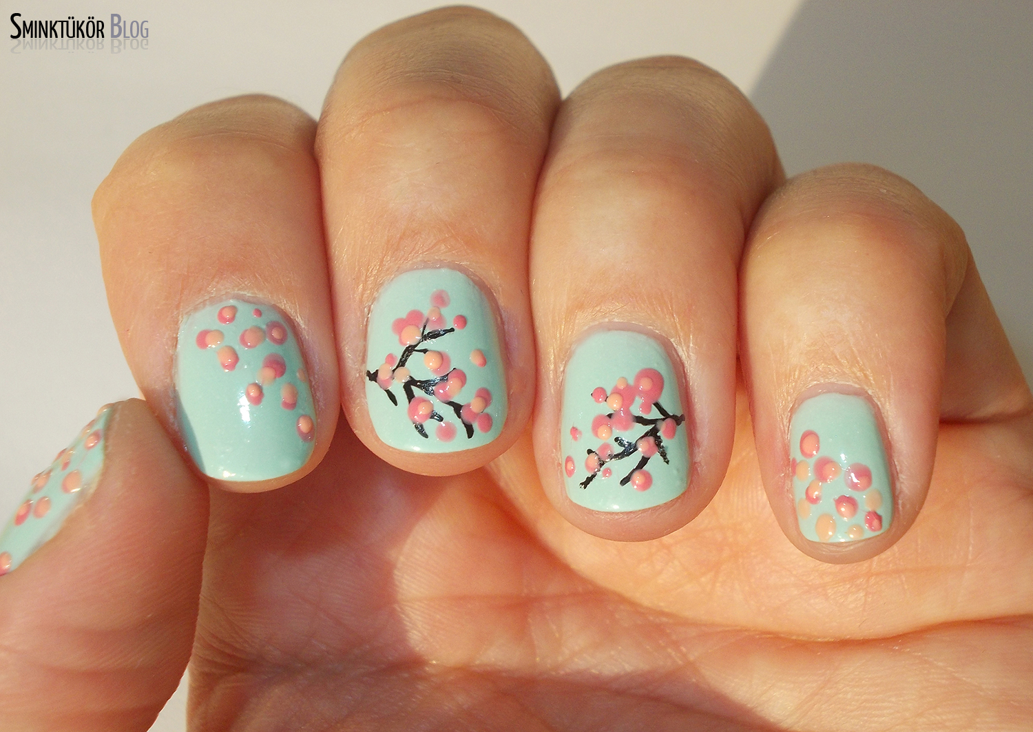 3. Pontozóval sötétebb rózsaszín pötty-virágokat festek az ágakra illetve a többi körmömre is, mintha azokat a virágokat már elvitte volna a szél. 🙂