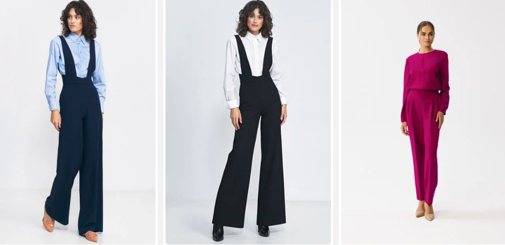Képek: Az oldalon számos képet talál az elegáns női overálokról, amelyek bemutatják a kialakítás részleteit és a különböző színeket és mintákat.