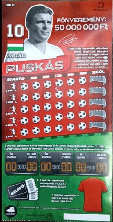 A képen egy kaparós sorsjegy látható, amely Puskás Ferenc híres magyar labdarúgó tiszteletére készült. A sorsjegy többféle játékot tartalmaz, amelyek részletesen le vannak írva a sorsjegyen: