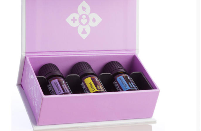 Íme a doTERRA aromaterápiás kezdőkészlet bemutatása három különböző illóolajjal: Levendula, Citrom és Borsmenta. A készletben minden illóolaj 5 ml-es kiszerelésben található.