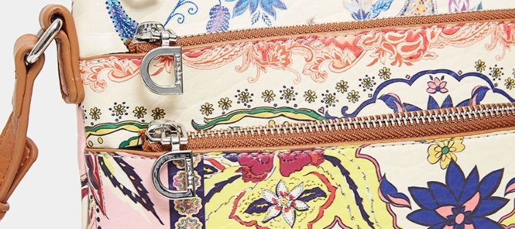 A Desigual táska virágmintáival, jellemzően bézs/tört fehér/púder/drapp színeivel, és keleti hangulatot árasztó mintáival több, mint vállra való választás. A 2021-ben teret hódító kollekciók jellegzetességei a terülő, eklektikus minták, és a mandalákra hajazó, nagy motívumok.