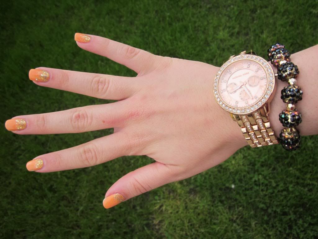 A körmöm, most teljesen véletlenül egyébként, de egyezett a felsőm színével. És hogy akkor már teljes legyen az összhang, arany ékszereket válogattam össze.