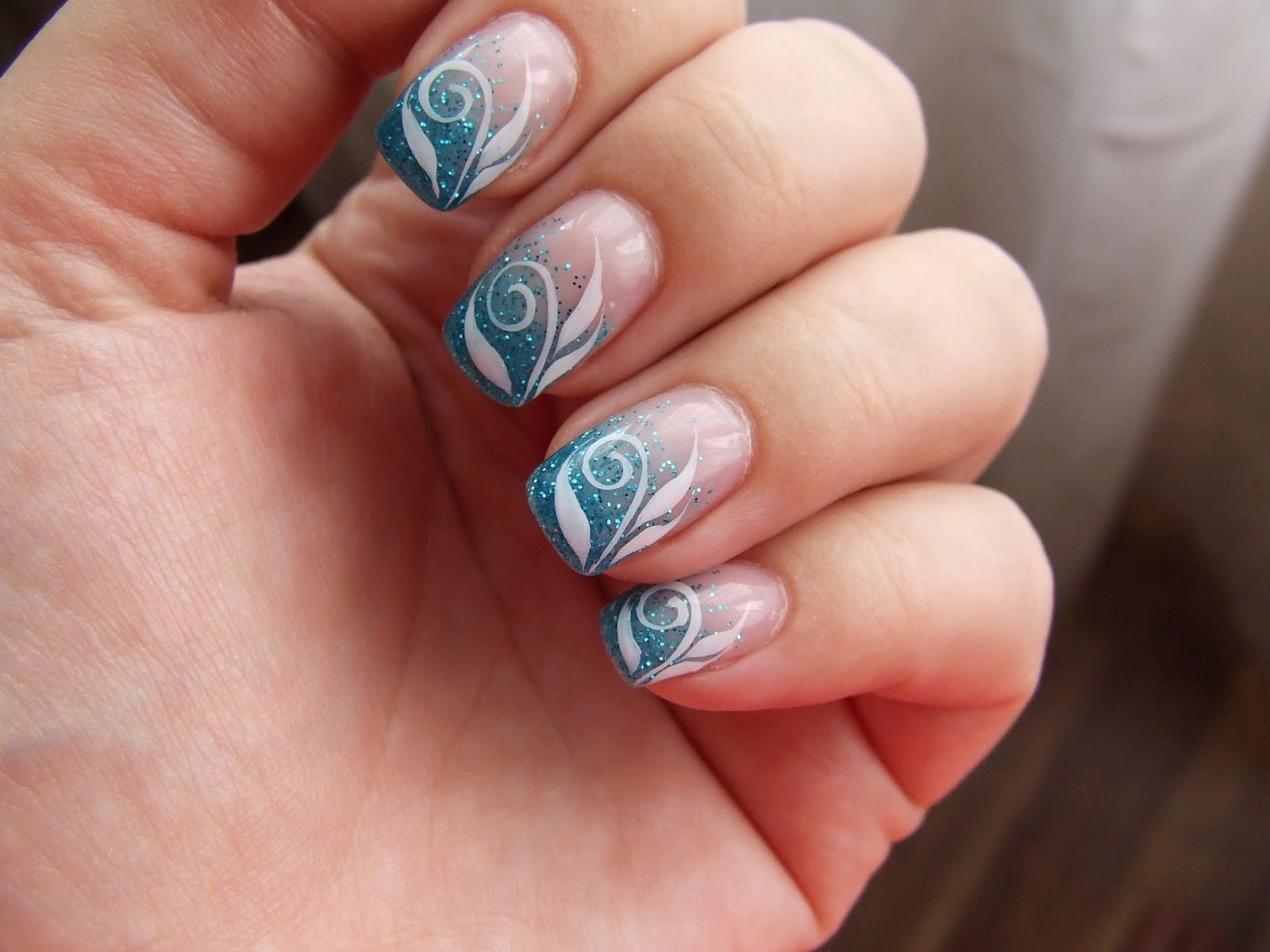 Azt hiszem Zsuzsi nagyon érzi, hogy mi az ami még belefér Nálam, és mi az ami nem. 🙂 Fehér francia körmök helyett türkizszínű, csillámos, átmenetes körmöket kaptam, “egyszerű” fehér virágdíszítéssel. Íme: