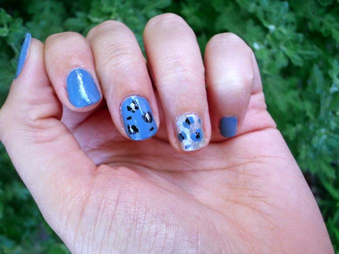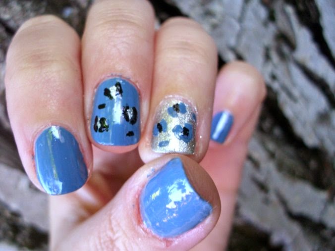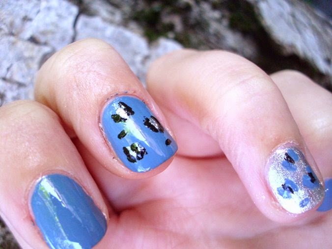 Alaplakknak az essence fedőlakkot vittem fel, mivel a körömerősítőm már lassan elfogy, és már eléggé sűrű és buborékos lett. Erre ment fel a Rimmel kék körömlakk. A gyűrűsujjamra az ezüst lora került, amelyre párducmintát is festettem. Valamint, hogy ne legyen túl egyhangú, a középső ujjamra is került párducminta.