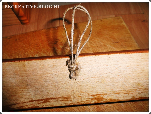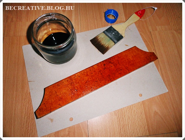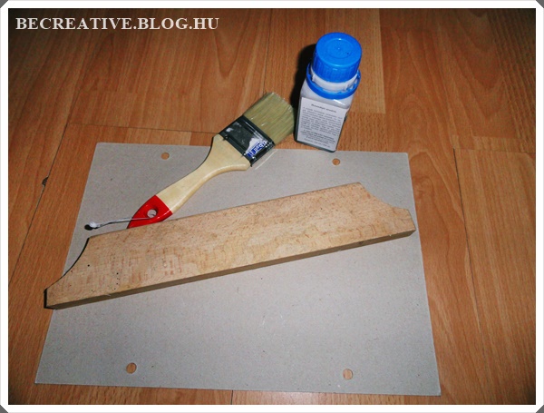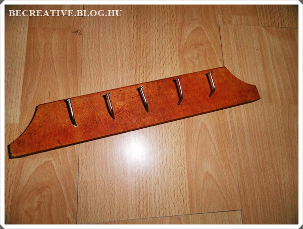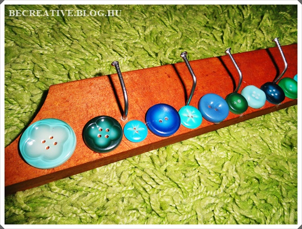 Először fapáccal lefestettem a deszkát, majd 5 szöget kalapáltam bele. Egy fogóval meghajlítottam őket. A gombokat és a hátuljára az akasztót ragaszópisztollyal ragasztottam fel. Ilyen egyszerű:)