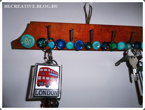 Eltört vágódeszkából, néhány szögből és itthon talált gombokból készült ez a kulcstartó fél óra alatt 0 Ft-ból.