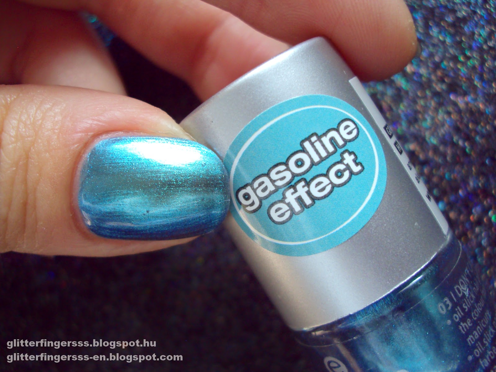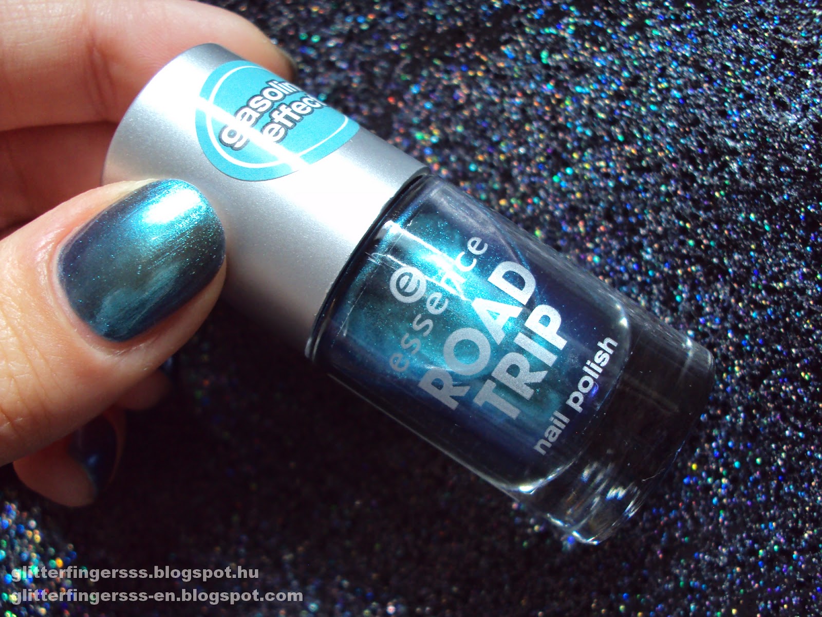 Rég hoztam már olyan lakktesztet ami éppen aktuális lenne, de az Essence új, Road Trip kollekciójában találtam egy szépséget, amit egyszerűen muszáj voltam megvenni. Imádom a metál, illetve duo/multikróm lakkokat, úgyhogy nem volt kérdéses, hogy kipróbálom ezt a kék/zöld csodát, ami gázolaj effektust ígér. A kollekcióból még izgatja a fantáziámat az aszfalt hatású lakk is, a másik kettő viszont nem érdekel.