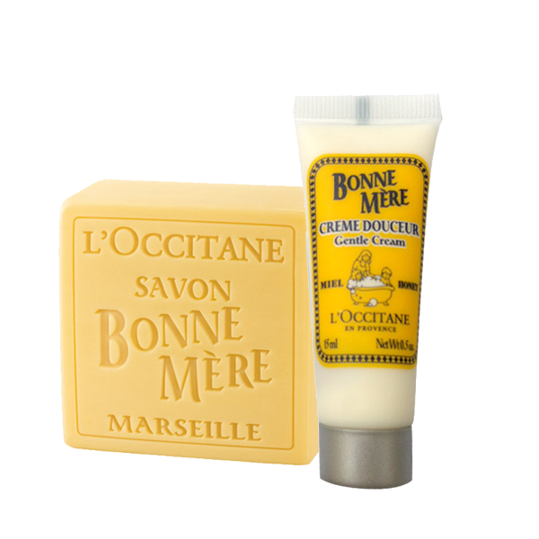 A duó tartalma: Bonne Mere Extra gyengéd mézes tusfürdő 15 ml és Bonne Mere mézes szappan 100 g.