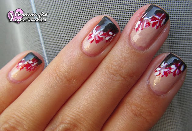 A ruha mintájából indultam ki a manikűr elkészítésénél. először nude-fekete ferde átkészítettem és ezek közé kerültek a piros-fehér virágok, már amennyire felismerhetőek lettek, mint virágok. 😀