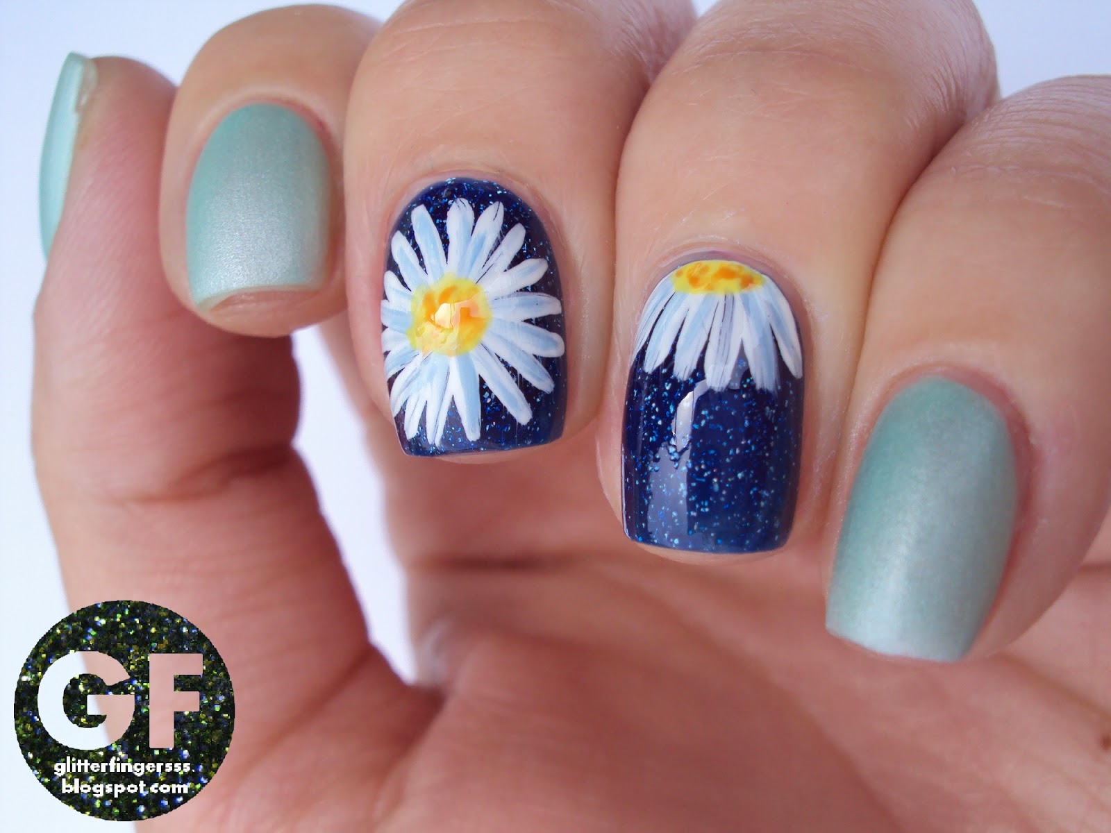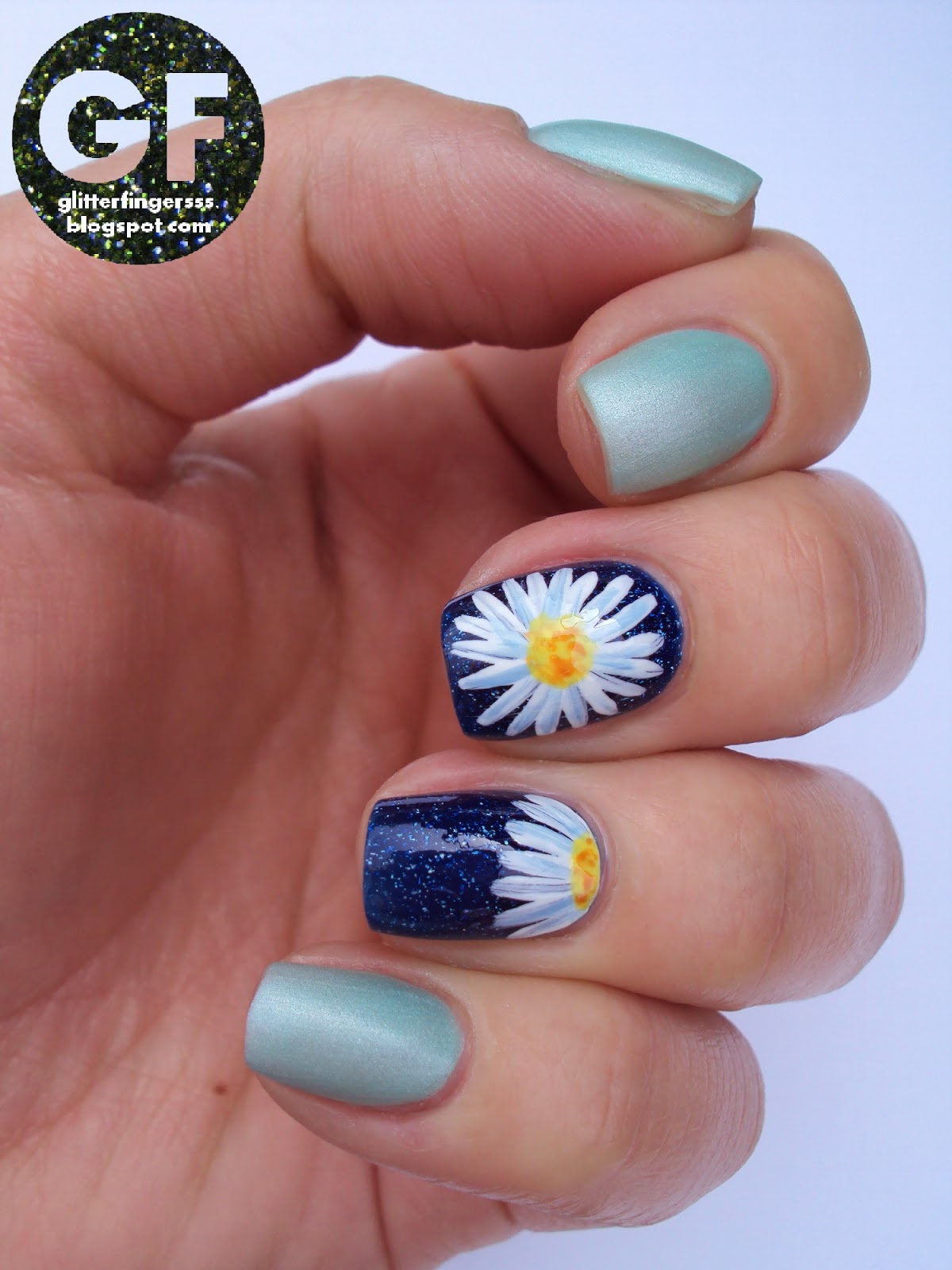 Nagyon megtetszett ez a virágos kihívás amit Manna indított, az egyik kedvenc mintám a virágminta, úgyhogy nem is volt kérdéses, hogy jelentkezem. Ma margarétás körmöket kellett festeni. Ilyet még nem nagyon csináltam, de azt kell mondjam az egyik legegyszerűbb virágminta. Vékony ecsettel fehér vonalkákat kell festeni, majd középre sárga pacát kell kenni és kész is van. Én a fehéret egy kis világos kékkel árnyékoltam, illetve narancssárgát is pötyögtettem középre, hogy kicsit realisztikusabb legyen.