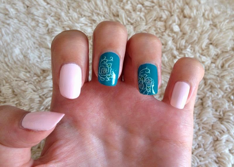 Ezt a manikűrt készítettem tegnap. Az ötlet onnan jött, hogy még volt egy olyan BPS matricám, amit nem próbáltam ki. A szín választás kicsit merész szerintem, mert bár a képeken nem látszik sajnos, de a világos rózsaszín lakkot egy zöldes lakkal párosítottam. A zöldes lakk élőben élénkebb, de nem tudtam élethűen lefényképezni.