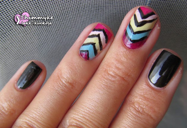 A kihívás első ruhadarabja az első bikini, az én kedvenc darabom a legújabb, idén vásárolt bikinim. 🙂 A NewYorkben bukkantam rá, és szerelem volt első látásra… Egy egyszerű fekete alsóból és egy színes cik-cakk mintás felsőből válogattam össze. 🙂 A manikűrnél is ezek inspiráltak, két körmömre színes cik-cak mintát festettem a többi pedig fekete lett.