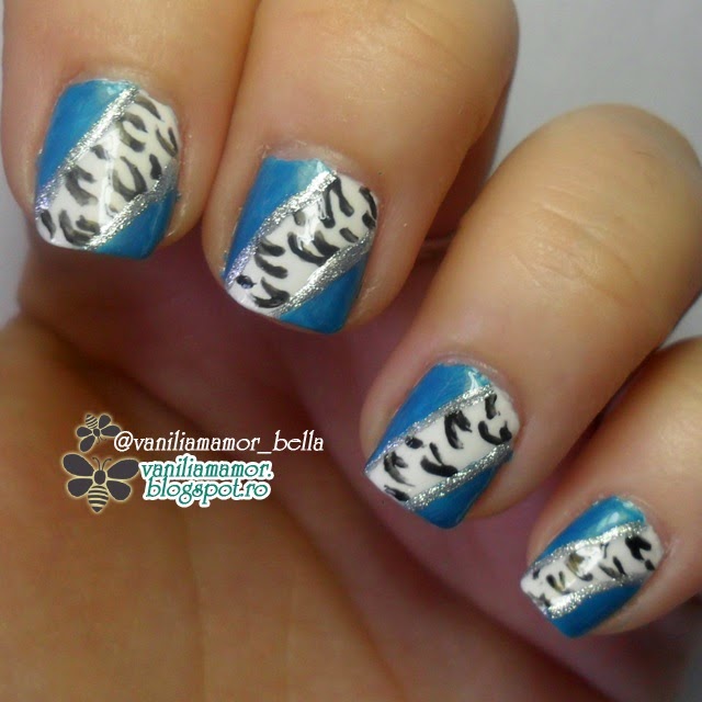 A mai, első témánk a kedvenc fürdőruha. Bár képet nem hoztam róla, az én kedvencem egy fehér-fekete, zebra mintás darab. Viszont legutóbb (öö… azt hiszem az tavalyelőtt ősszel volt) egy kéket használtam, így a kettőt kombinálva született meg ez a mani.