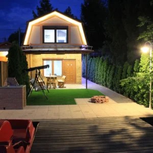 Vízibicikli, csónak, napozóágyak, grillsütő, napernyő, hintaágy.