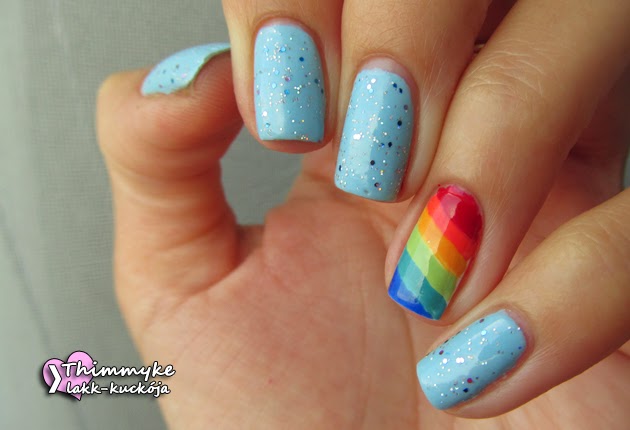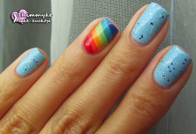 Az utolsó előtt témája a kihívásnak Rainbow Dash, a kék színű, szivárvány sörényű póni. Ismét nem bonyolítottam túl dolgot, mégis minden benne van szerintem a manikűrben, aminek benne kell lennie. 🙂 A gyűrűs ujjam szivárvány mintát kapott, a többi pedig egy halvány kék lakkot némi csillámmal.