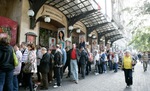 Hosszú sorban várakoznak a nézők a Madách Színház előtt, hogy megvásárolhassák jegyeiket az évad zenés előadásaira.