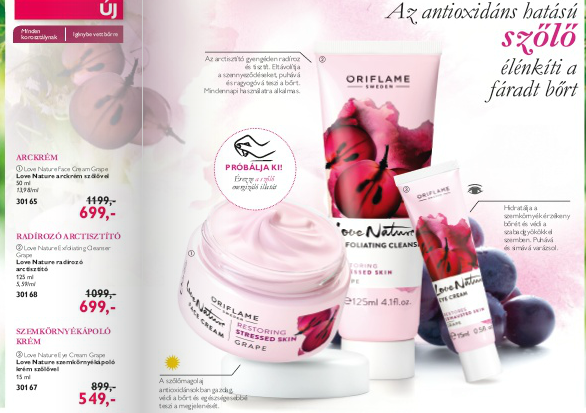 Megújult Love Nature termékcsalád ebben a katalógusban két új változattal is bővül. A szőlős termékek az igénybe vett, fáradt bőr ápolására nyújtanak megoldást, magas antioxidáns tartalmuknak köszönhetően. Arckrém, radírozó arctisztító és szemkörnyékápoló található az újdonságok között.