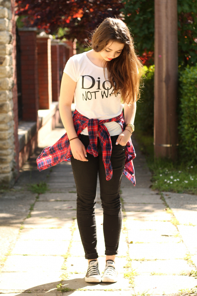 Mostanában nagyon rákaptam a fehér alapon, feketével nyomott feliratos pólókra, így mikor a Látomás Dohány utcai üzletében kiszúrtam ezt a darabot, a maga 2800 Ft-os árával nem hagyhattam ott. Annyira jó, hogy bármivel kombinálhatod, de tényleg. Felvehetsz hozzá egy csini kis szoknyát blézerrel, de akár így is hordhatod mint én, kockás inggel és Converseszel. Tervben van vele még sok összeállítás, úgy megszerettem, meg a felirat is találó rajta, nem? 🙂