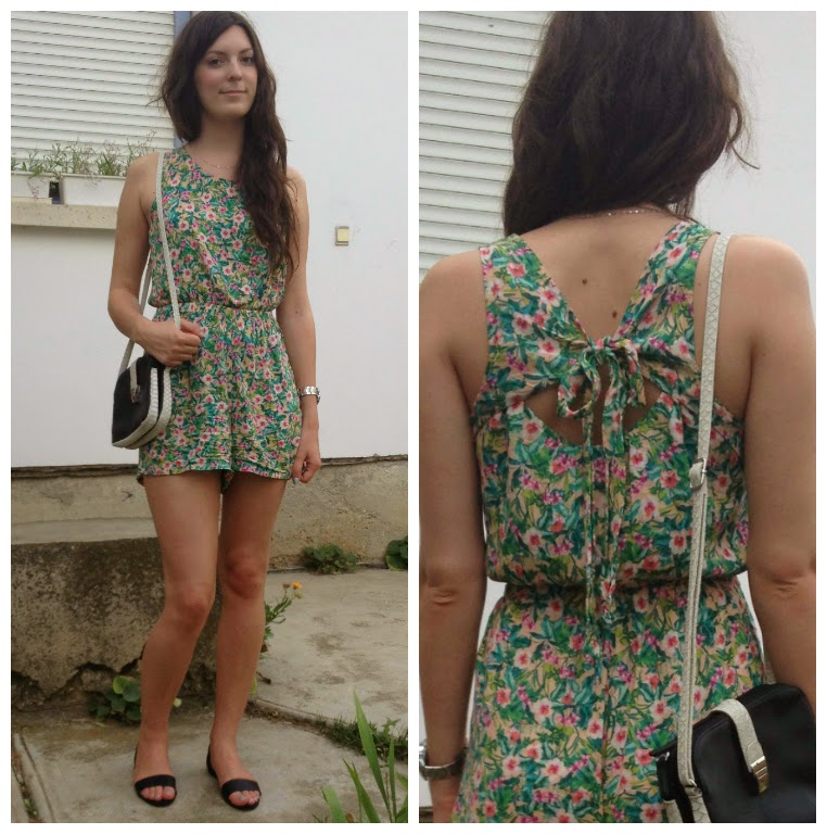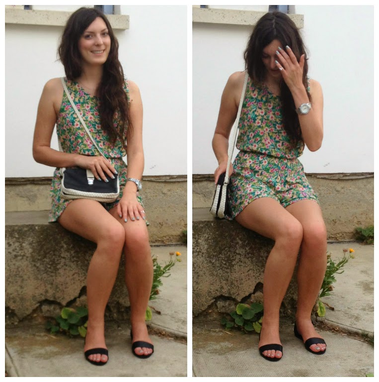 Ennek a posztnak a főszereplője a nem rég vásárolt virágmintás romper-em. Nagyon tetszenek ezek az egybe ruhák, melyeknek az alja rövidnadrágos. Igazán kényelmes viselni a nagy melegekben. Kiegészítőként csak egy órát, meg egy ujjperc gyűrűt vettem fel, hiszen ez a ruha önmagában is elég feltűnő.