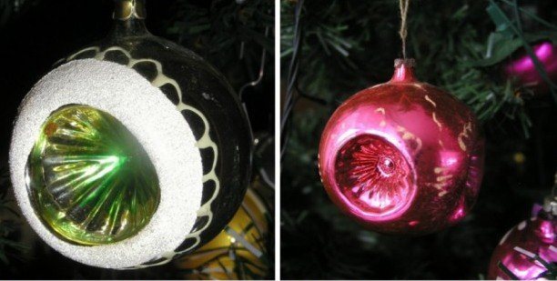 A retro gömbdíszek közül voltak egészen különlegesek: szépen megmunkáltak, ahol „bemélyedésben” műanyag figurákat rejtettek el, volt amelyik a csillámpor elődjével, valamiféle ezüst vagy arany szórással volt ékesítve, volt amelyiket festést csodálhattunk meg minden évben.