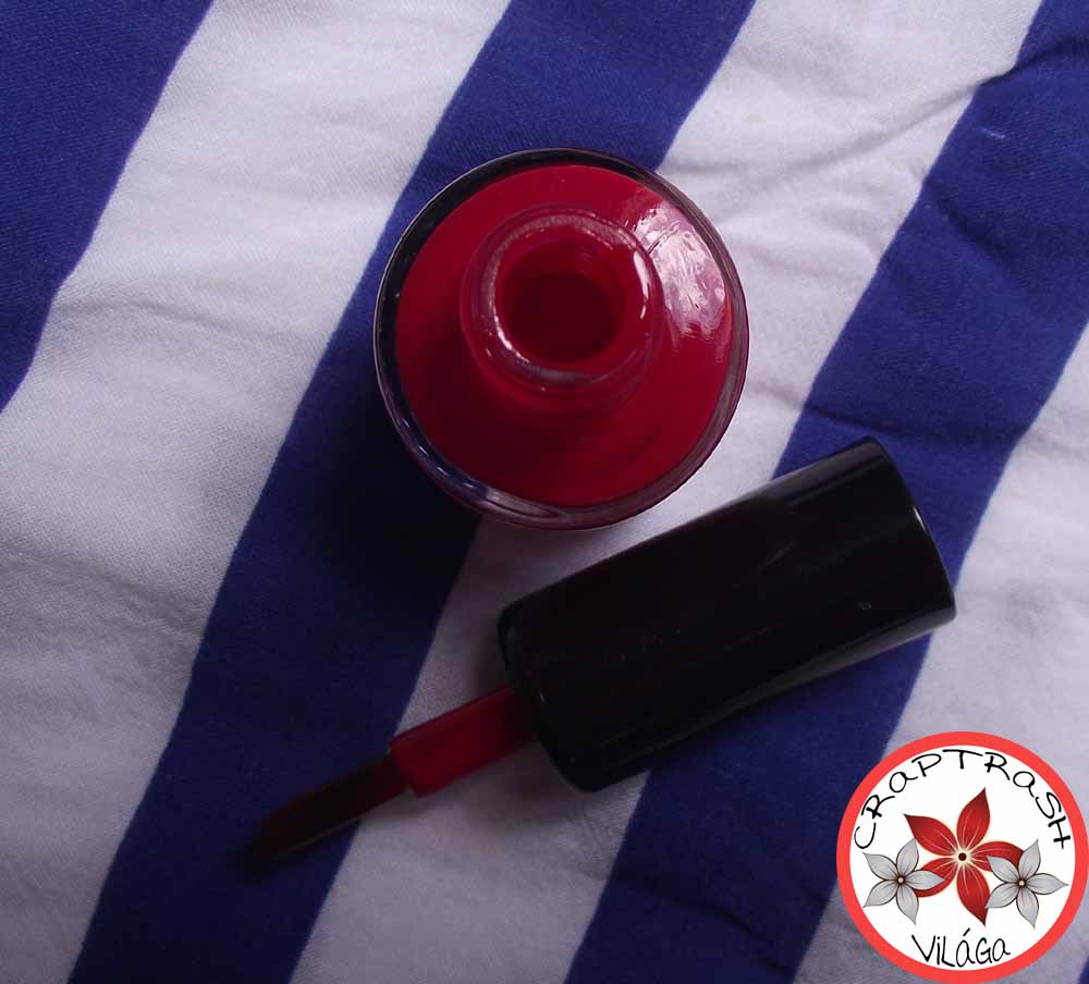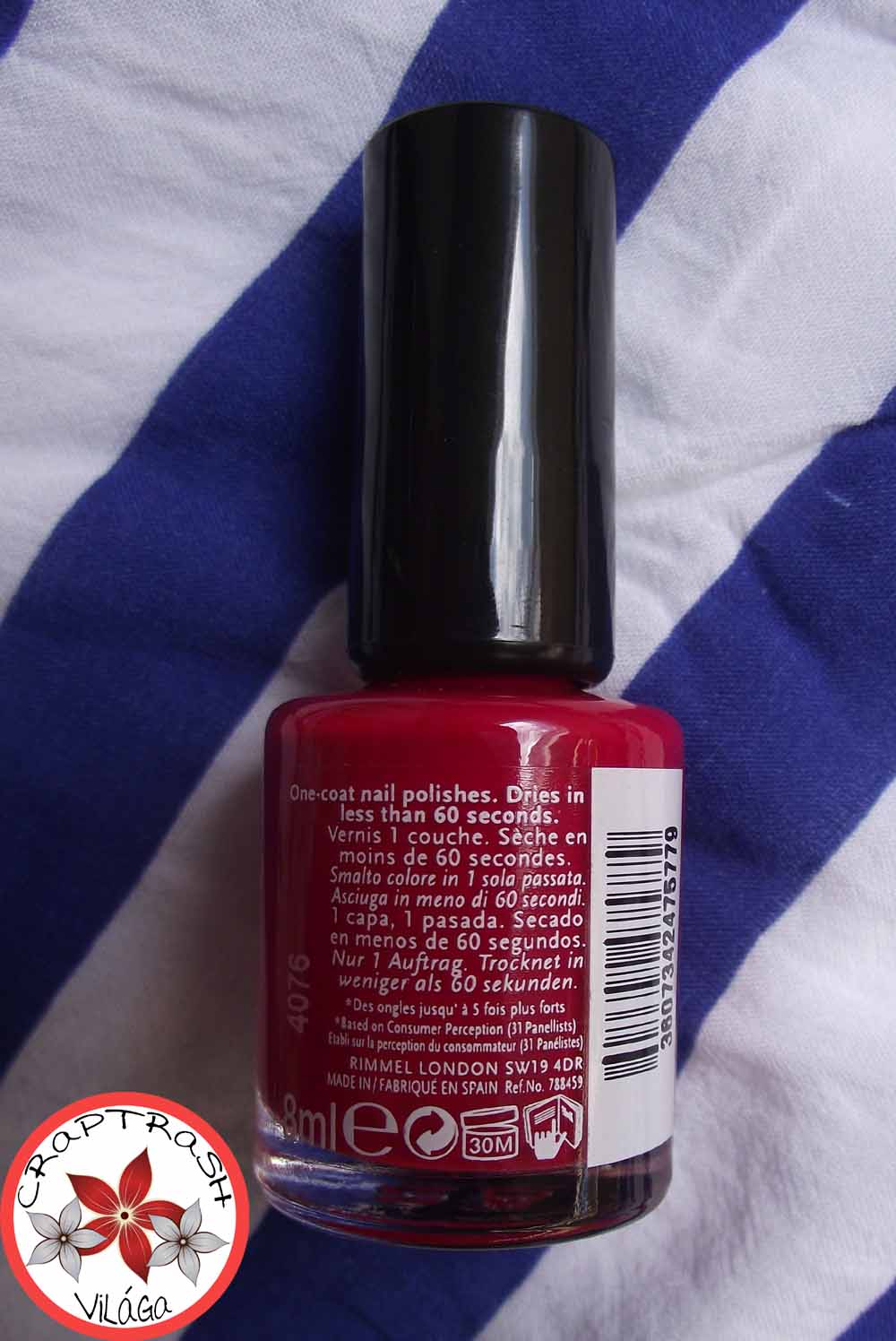 Csomagolás: A csomagolása ugyanolyan, mint a többi mostani Rimmel körömlakknak. Átlátszó alapon fehér feliratos matrica. Igazából nekem még mindig tetszik, hogy vékonyabb a kupak, mint az üvegcse, így felülről is látni, melyik milyen szín.