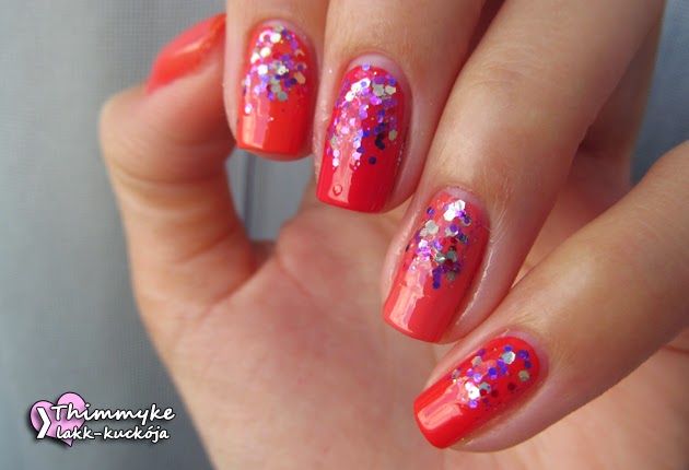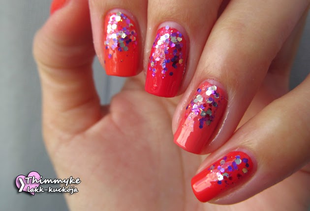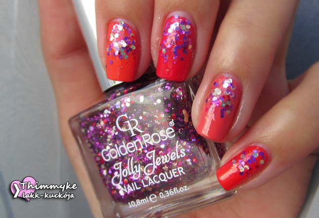 Végül négy narancsos árnyalatra esett a választásom, amit feldobtam a Golden Rose Jolly Jewels 120-as lakkjával. Nem is gondoltam, hogy egy lila-pink csillámos lakk ilyen jól mutathat a narancsos alapokon… 🙂