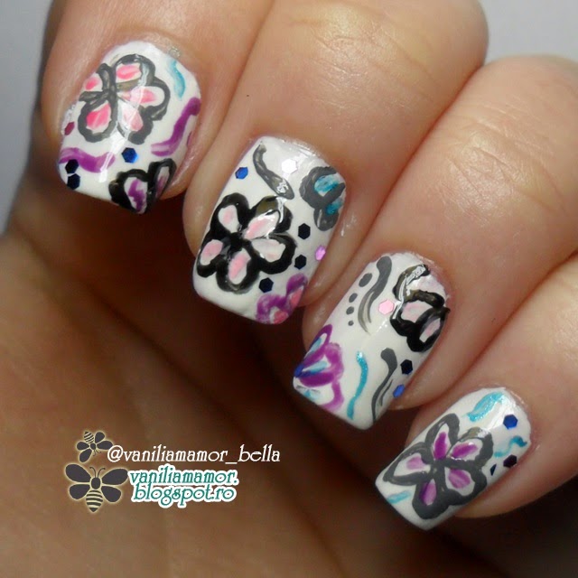 Nekem főleg a színek miatt tetszett. 🙂 Nem tudom, ti hogy vagytok vele, de én az utóbbi időben egyre több virágos manikűrt készítek. 😀