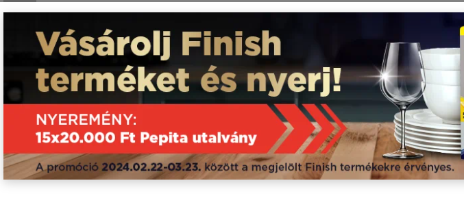 Vásárolj a megjelölt Finish termékek közül és nyerd meg a 15 db 20 000 Ft-os Pepita vásárlási utalványok egyikét, melyet a Pepita.hu oldalon tudsz levásárolni!