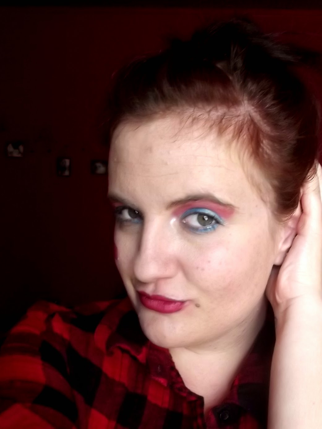A témában alapvetően a zászlót helyeztem a középpontba. Nem szerettem volna valami nagyon extrém, egész arcos, maszk hatású dolgot, így a szemhéjamra is a zászló színeit vittem fel egybemosva, míg az arcomra is felfestettem. Különösebb mesélnivalóm nincs róla, ez lenne az én szurkolói sminkem!